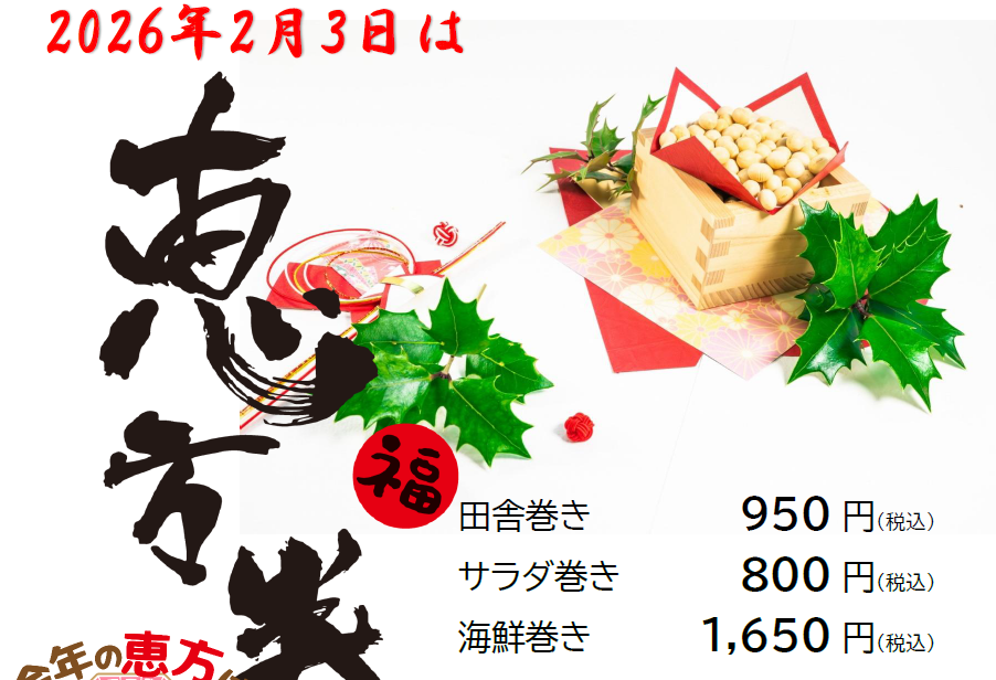 2月3日の節分に、今年も恵方巻き3種類をご用意いたします!